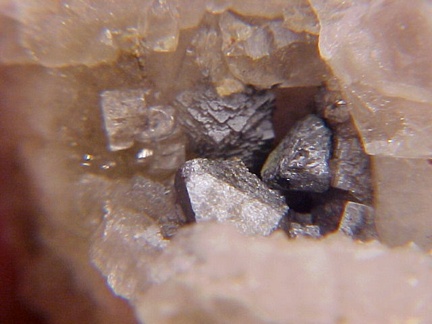 Upon close inspection the fluorite crystals closest to the acanthite has a slight, silvery sheen on its surface - a