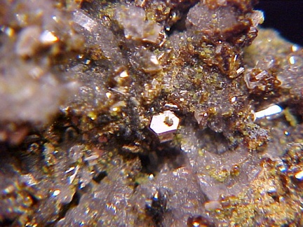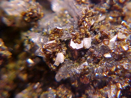 quartz points!!! The beudantite crystals are present as sharp, hexagonal tabular crystals with amber-brown color,