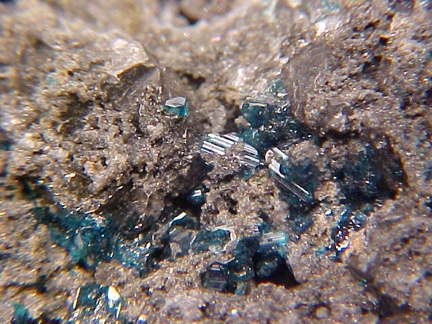 perched on a vuggy matrix in association with scattered crystals of cerussite!!! The caledonite crystals have sharp, glassy faces with