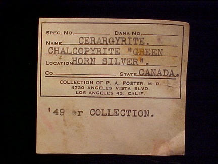 be a combination of weathered chalcopryite and chlorargyrite in a very fine grained, clay-like mass!!! This specimen retains an old label from the collection