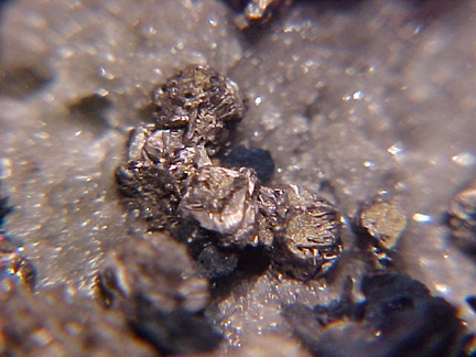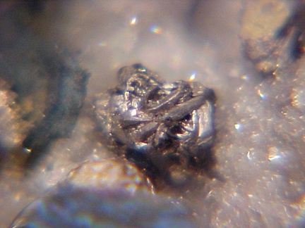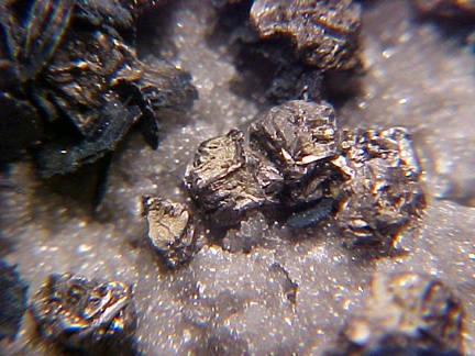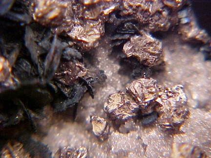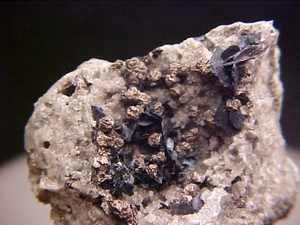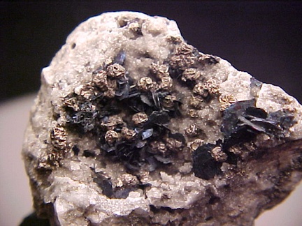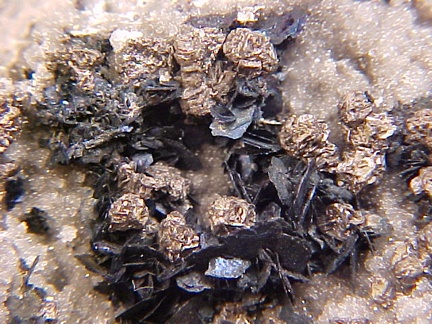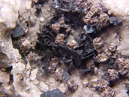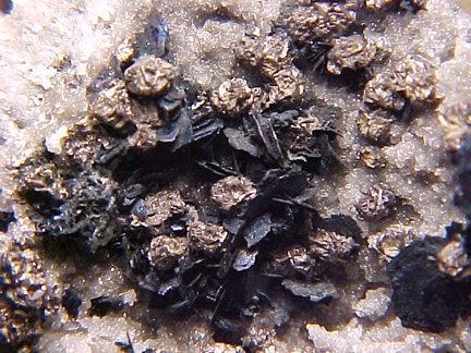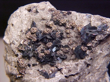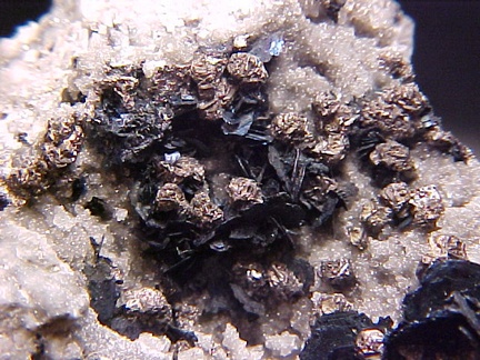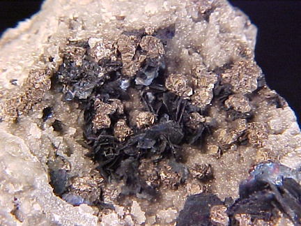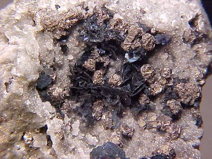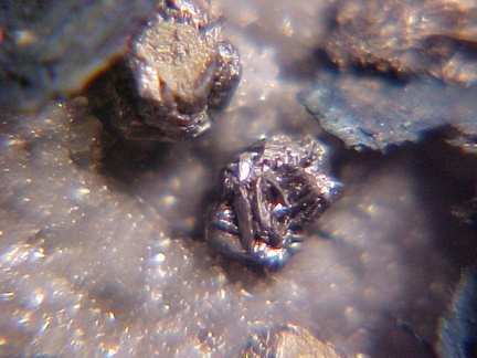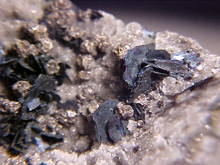 finely bladed covellite crystals - partially altering to chalcocite in association with numerous complex colusite