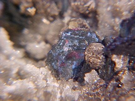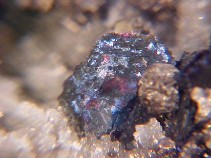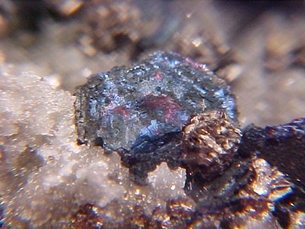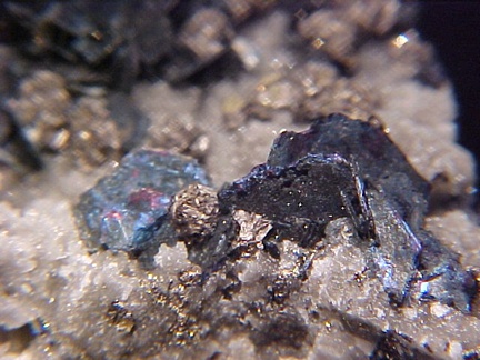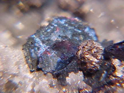 bluish iridescence!!! The slight roughness of the covellite crystals is due not to damage but to