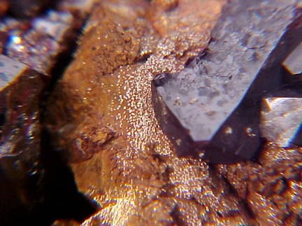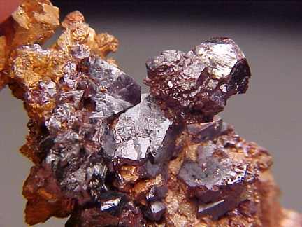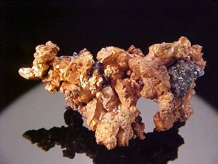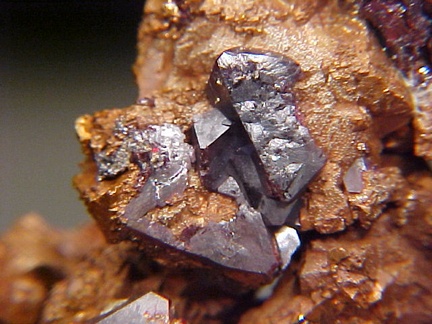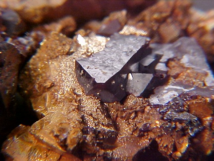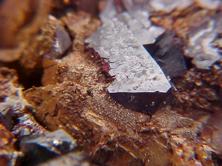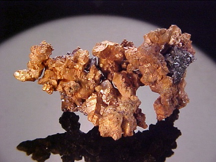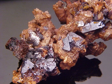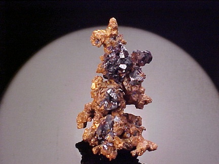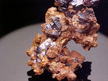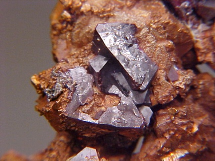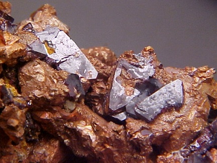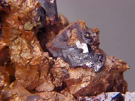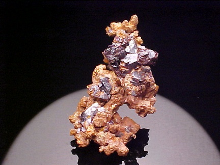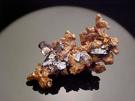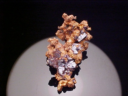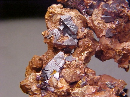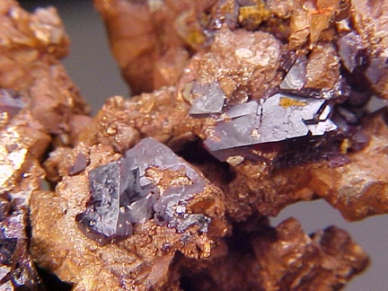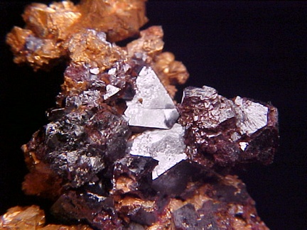 close inspection, one can see tiny, submillimeter crystals of native silver on the surfaces of the native copper surrounding the cuprite crystals!!! In addition, there