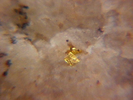 numerous tiny areas of native gold!!! The native gold is present as scattered submillimeter masses both on and included in the quartz matrix!!! Upon