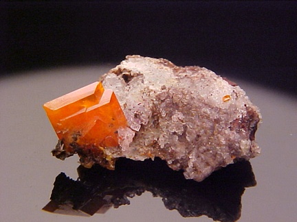 A classic example of wulfenite from this famed local!!! This specimen hosts a sharp, glassy crystal of intense red-orange wulfenite prominently