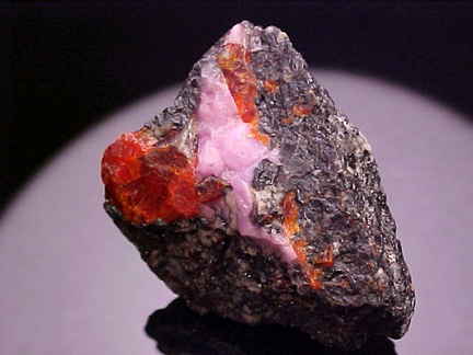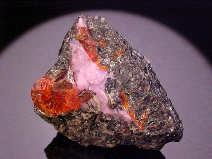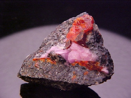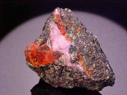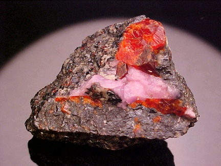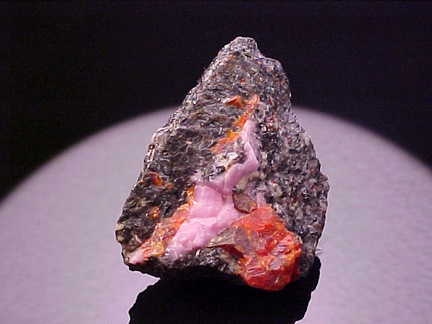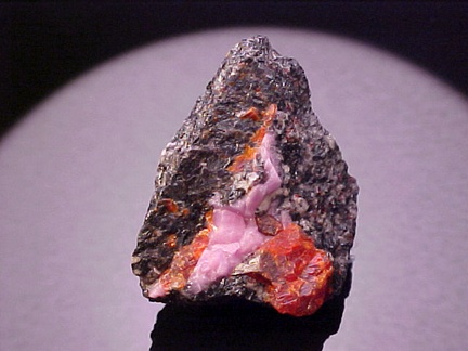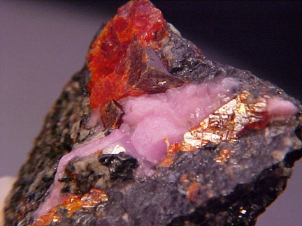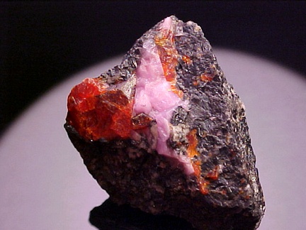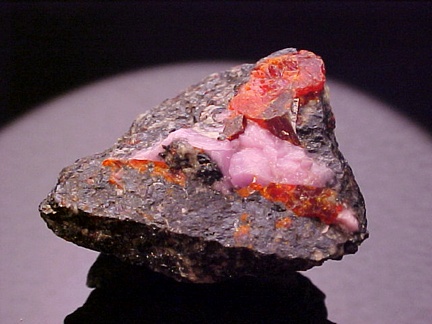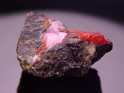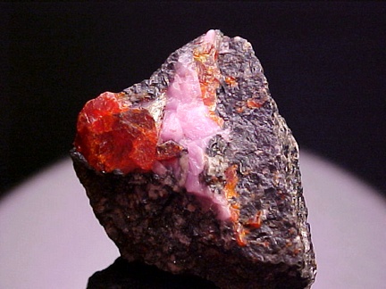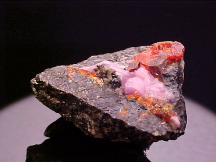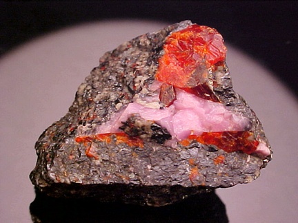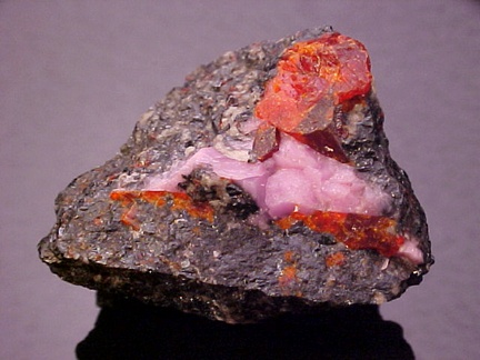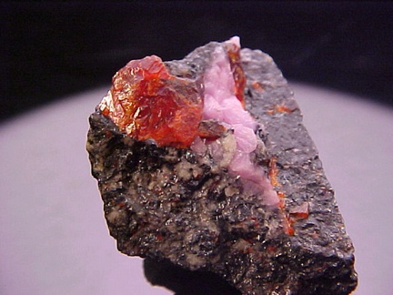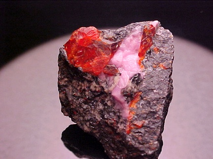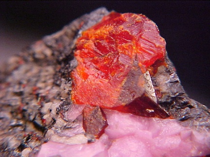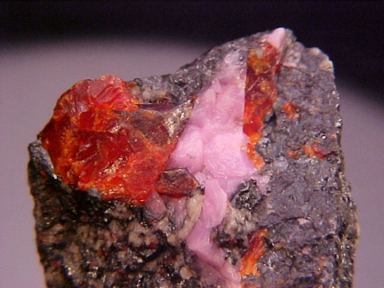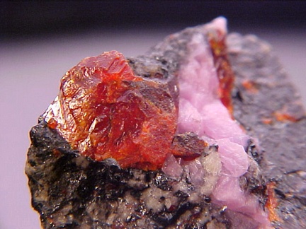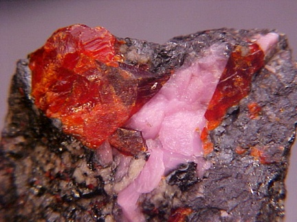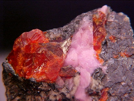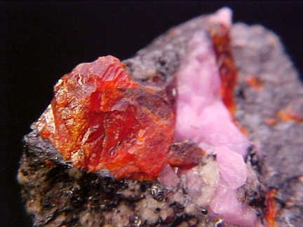 hosts a stunning pairing of gemmy crystals of zincite in association with rare pink hodgkinsonite!!! The zincite crystals have wildly intense