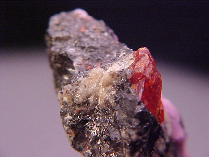 small white area on one of the sharp faces of the zincite crystal - this is a small recess on the crystal itself that hosts a tiny area of a very white